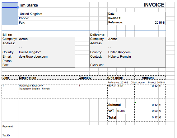 Invoices generated using the Wordbee template will either be downloaded as an Excel File (.xlsx) or PDF File (.pdf). An Excel file will appear similar to what is shown below: