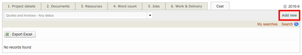 First, access the Costs Tab for the project. If no quotes exist for the standard project, the screen will appear as shown below. To create a quote for a supplier, first click on Add New in the upper right corner of the screen.