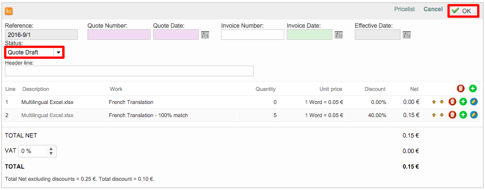 The quote information will appear as shown below. Be certain to review the pricing information to ensure it is correct. The drafted quote will show all work for the project along with any applied discounts for fuzzy matches. The total cost is displayed at the bottom of the invoice.