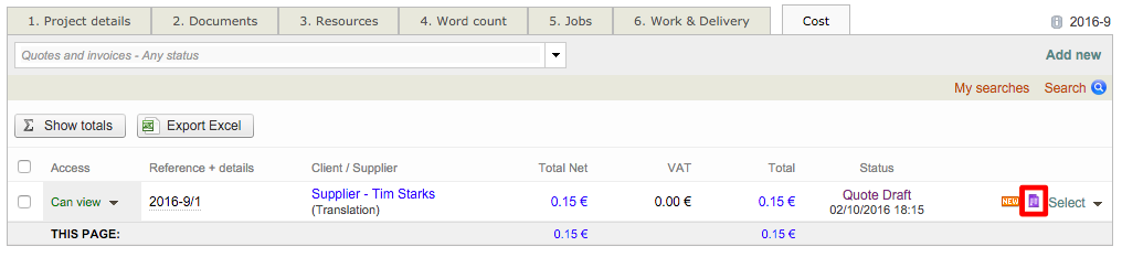 You will automatically be redirected to the Cost Tab for the project. Here you will be able to see view the quote, cost information, make changes, and download the file. Use the Purple Document Icon to download the Excel File (.xlsx) or PDF File.