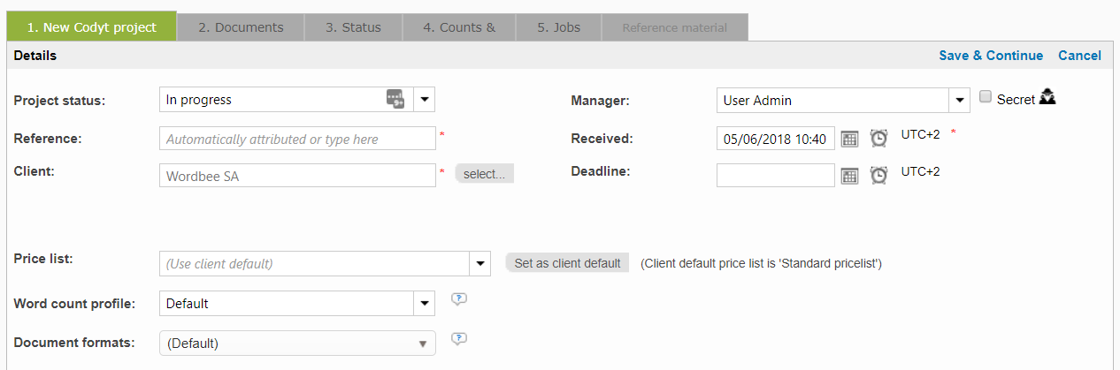 The first screen you will see is the the Project Details or Project Settings Information, as shown below for a Standard Project or a Codyt Project: