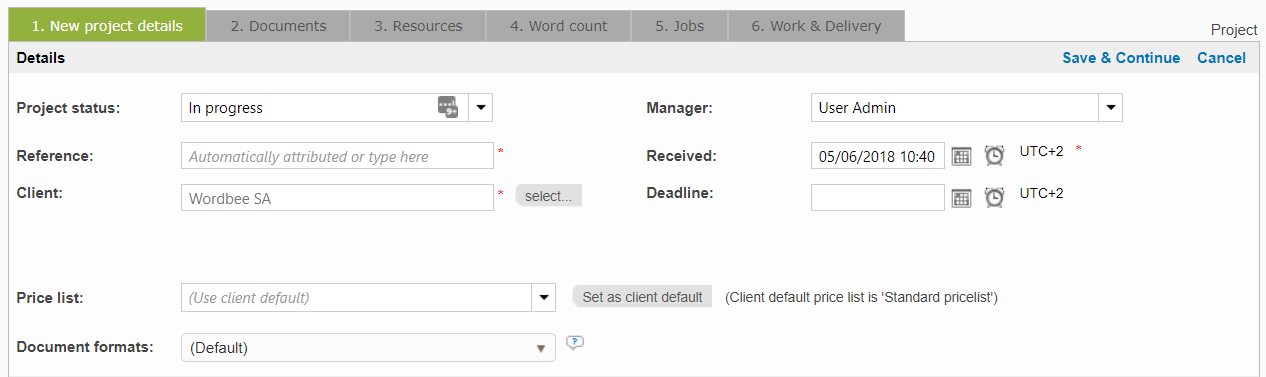 You may click on the Projects Menu to view existing projects or to use this menu to add a new project in Wordbee Translator. For this example, we will simply show the screen for a new project.