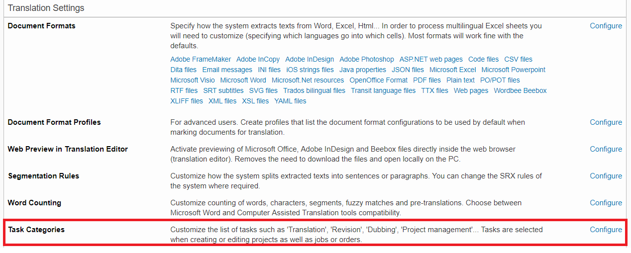 To access the settings for task categories, first click on Settings in the top right of the toolbar. Then scroll down to the Translation Settings section. Click on Configure to the right of Task Categories.
