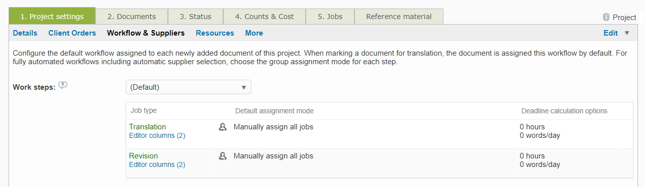 If you chose a Codyt project, you will be able to define the tasks of your project for each language combination in the Workflow and suppliers subtab.