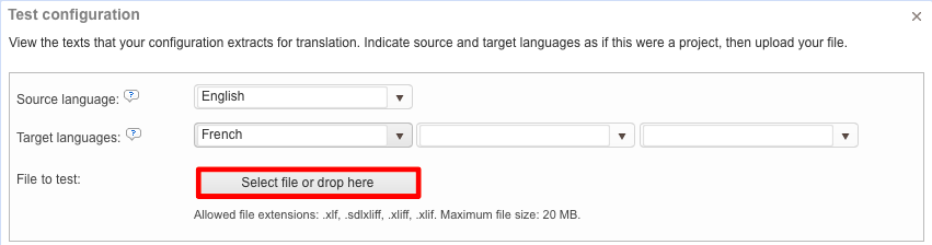 Then select the Target Language(s) and browse to or drag and drop the file you want to use for testing the custom configuration. If the operation is successful, then your configuration is ready to be used for future file translations.