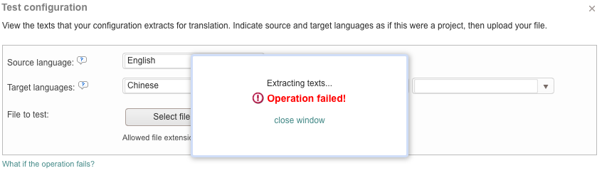 Once the test has finished, the translated target file will automatically appear in your Downloads Folder or another designated location depending on how Wordbee Translator is configured. If there is a problem with the file configuration you are testing, you will see the following message: