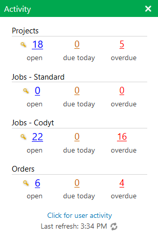 The Activity panel, above the Calendar panel, shows work status information such as the number of projects created, if the deadlines have been overrun or not, the number of jobs open,etc