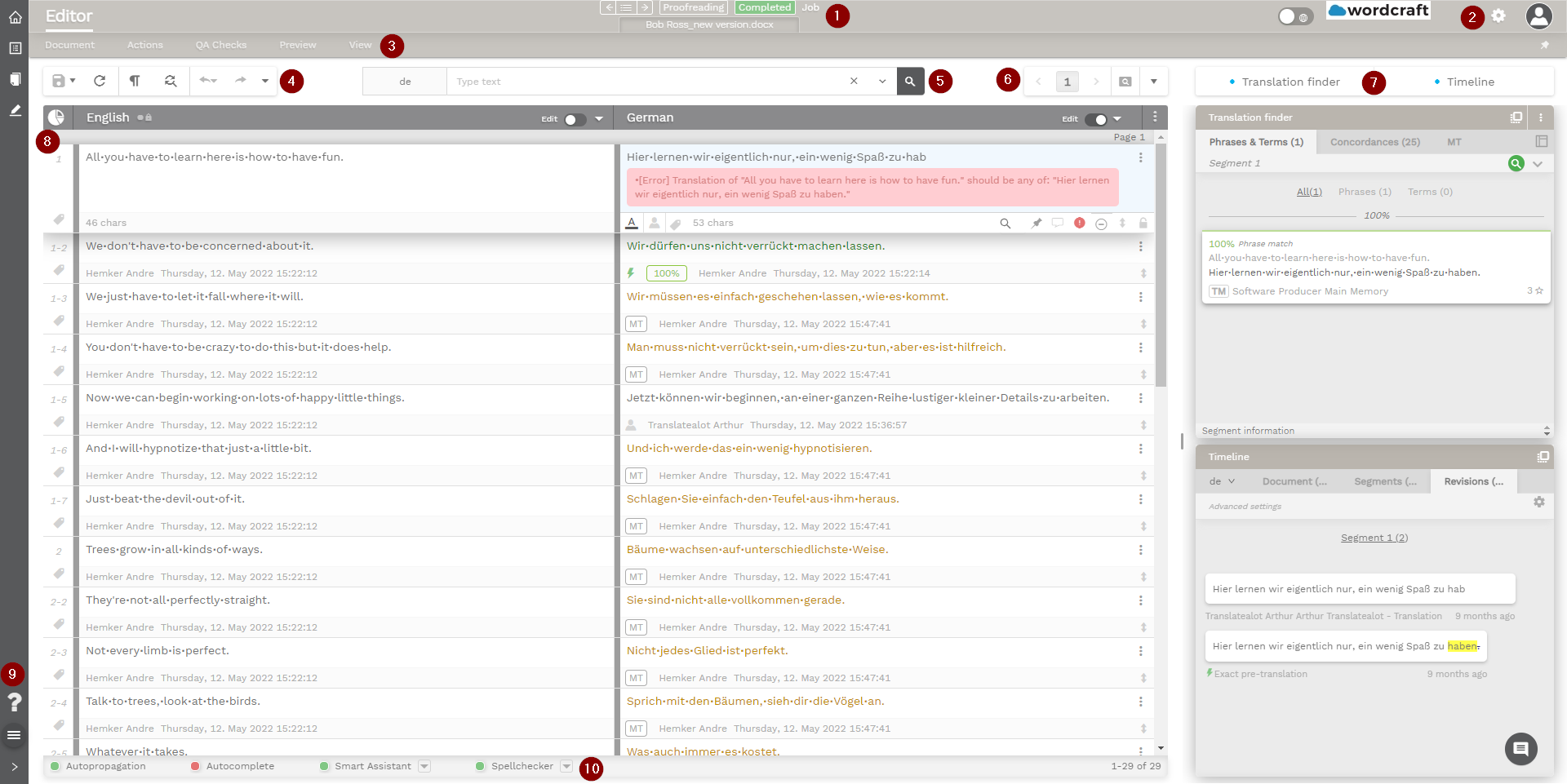 Through Autopropagation translations will be automatically inserted into identical repetitions within the same document. | |