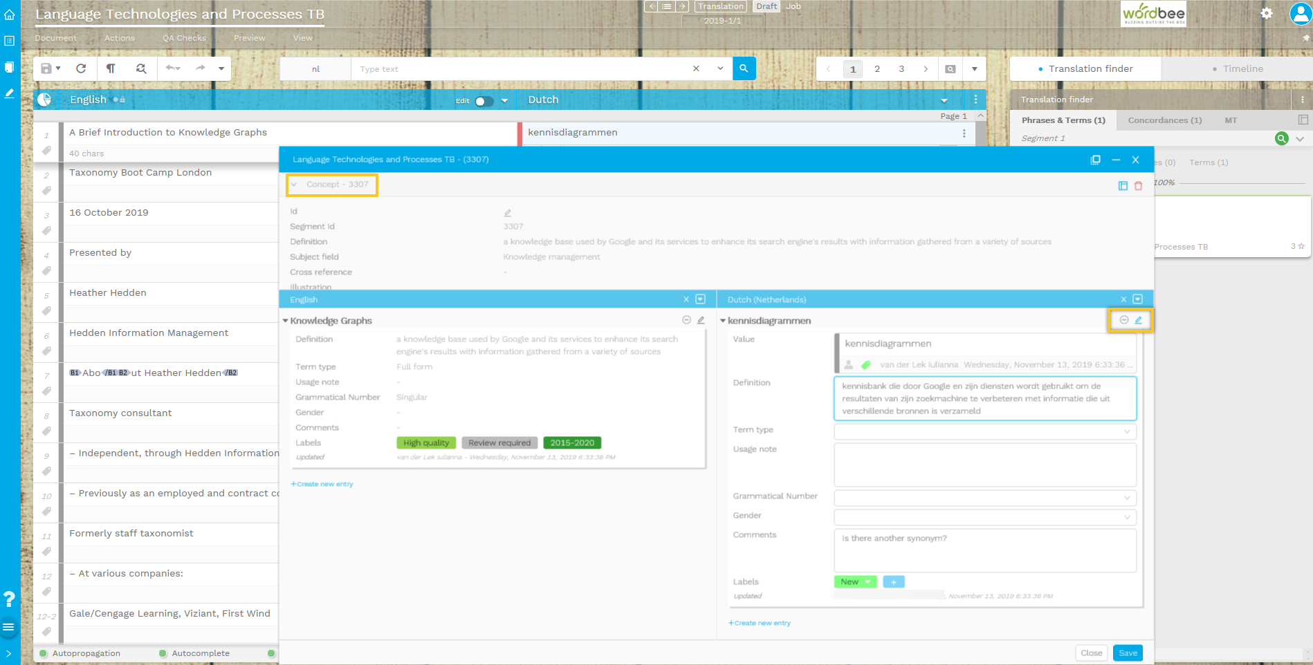You can not only receive term suggestions from the Wordbee's Terminology Management Tool databases enabled by the Project Managers, but you can also access and edit the concept entries stored in the database directly from the interface of your CAT tool Editor. Moreover, you can open the term entries in the Multicolumn Editor and translate a list of terms in multiple target languages.
