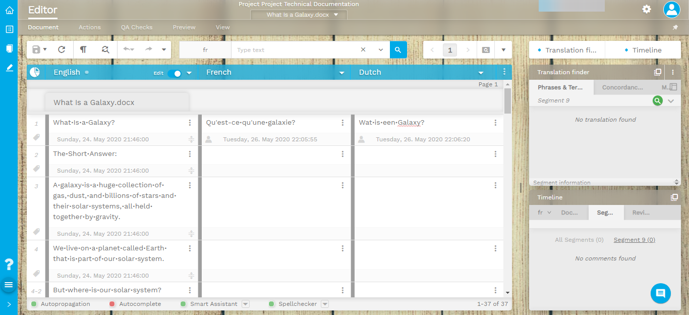 You can translate faster with autocomplete suggestions directly from your translation memory and terminology databases. The automatic QA checks warns you of potential formatting errors, inconsistent translations or use of forbidden terminology.