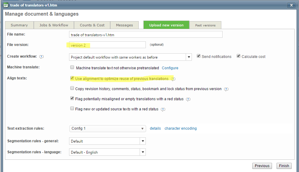 - Jobs which were in progress will pass into completed → New version will be not started/not assigned depending on the type of supplier dispatching you have chosen (retrieve previous worker of the job, original project assignment, etc.). These users will be notified of an update on the text leading to a new job, due to the versioning process.