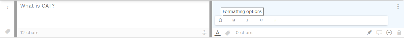 ![]() | ![]() | Segment formatting Remember This menu is only supported in the following file formats: Ω: list of special characters. Find how to enrich your personalized list here. Text formatting: B: bold text I: italic text U: underline ⤒ : subscript and superscript |