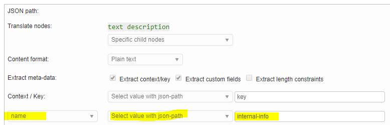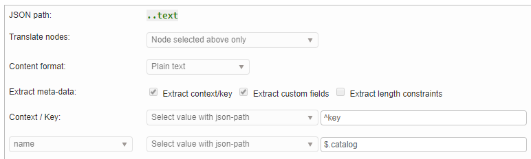 In the JSON below we want to translate the “text” properties and attach to it the meta-information “key” and “catalog”. The “key” is one object level above “text” and the “catalog” is at the root. How do we select those fields?