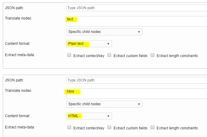We achieve this by simply defining two JSON paths. One for our plain text nodes and one for our HTML formatted nodes: