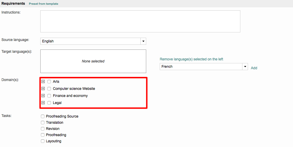 For example, if the translation is for a Legal Document, then the Legal Domain would be chosen within a project as well as for the linguistic resources that will be used for the jobs within that project.