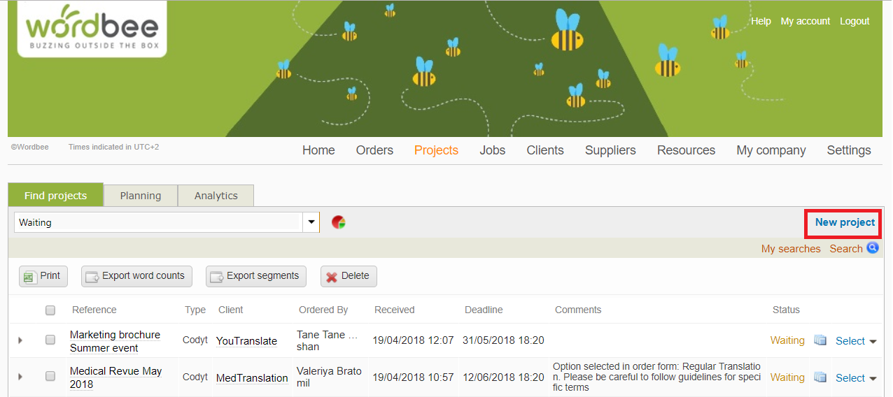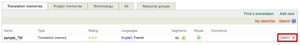 Translation Domains may be viewed within a new or existing project. To do so, either click on the Projects Menu and create a new project or simply click on Select for an existing project within Wordbee Translator.