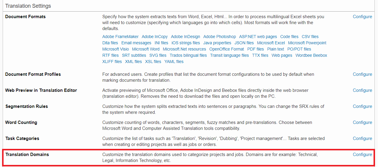 Translation Domains may be configured in the following areas within Wordbee Translator: