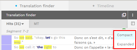 The compact view provided a larger amount of results from your translation resources. It also enables you to filter the results you are most interested in.