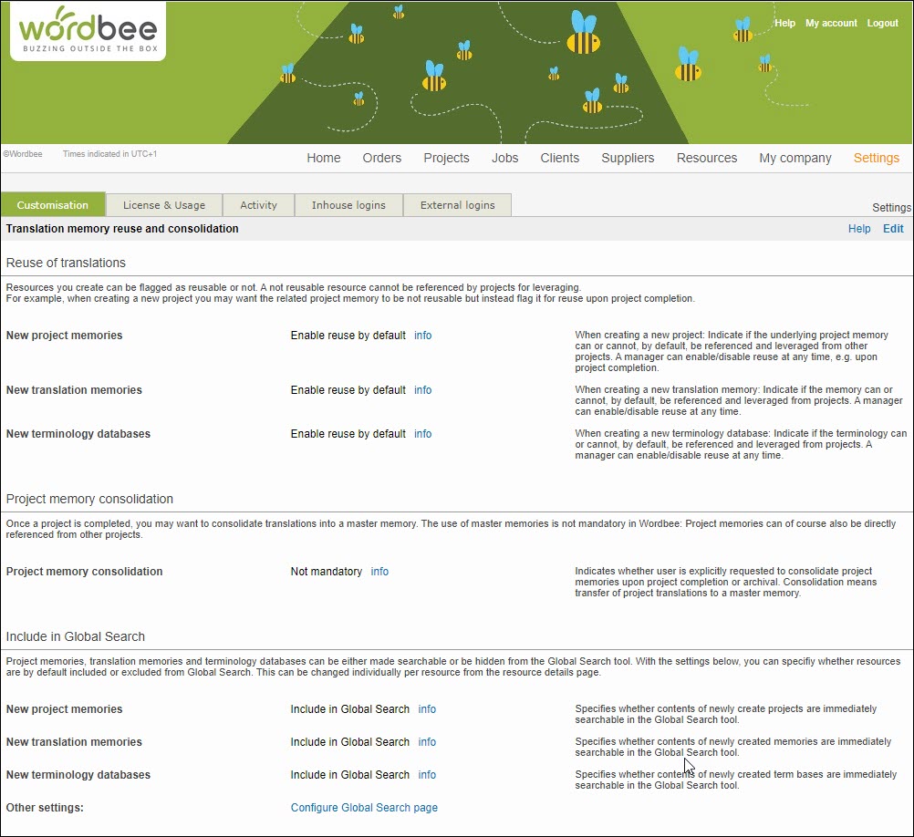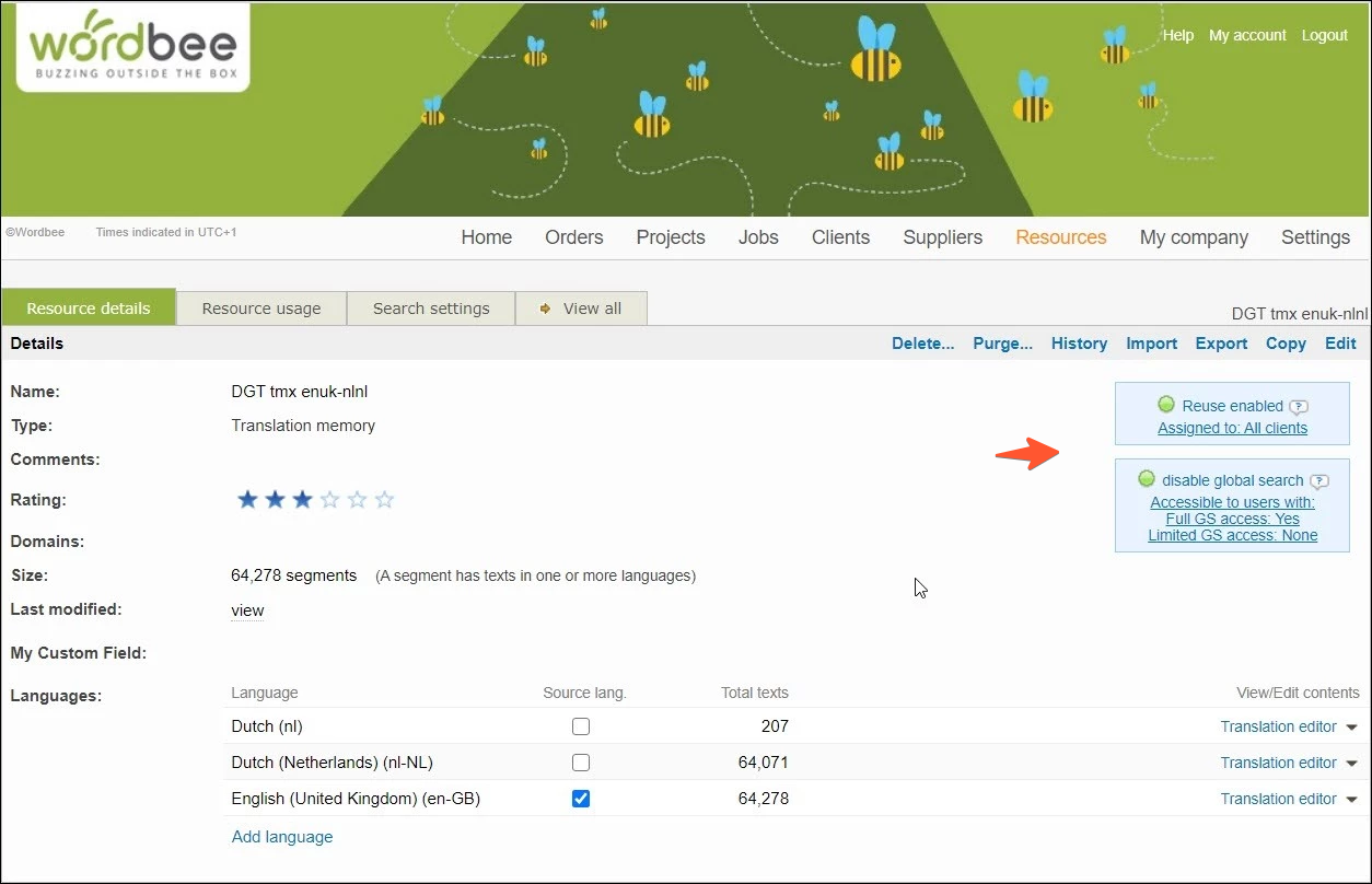 The resources you create or import into the Wordbee Translator platform can be flagged as reusable or not. A resource that is not marked as reusable cannot be referenced by projects for leveraging. For example, when creating a new project you may want the related project memory not to be reusable but instead flag it for reuse upon project completion.