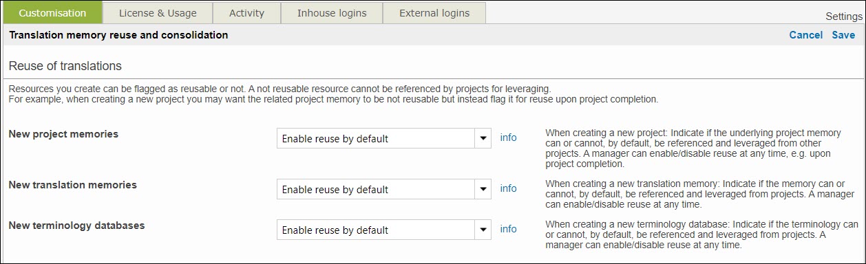 Go to Settings > Translation Memories and open the configuration of Translation memory reuse and consolidation. Use the Edit button to enable or disable settings. Once you save the changes, they will be applied to all your resources.