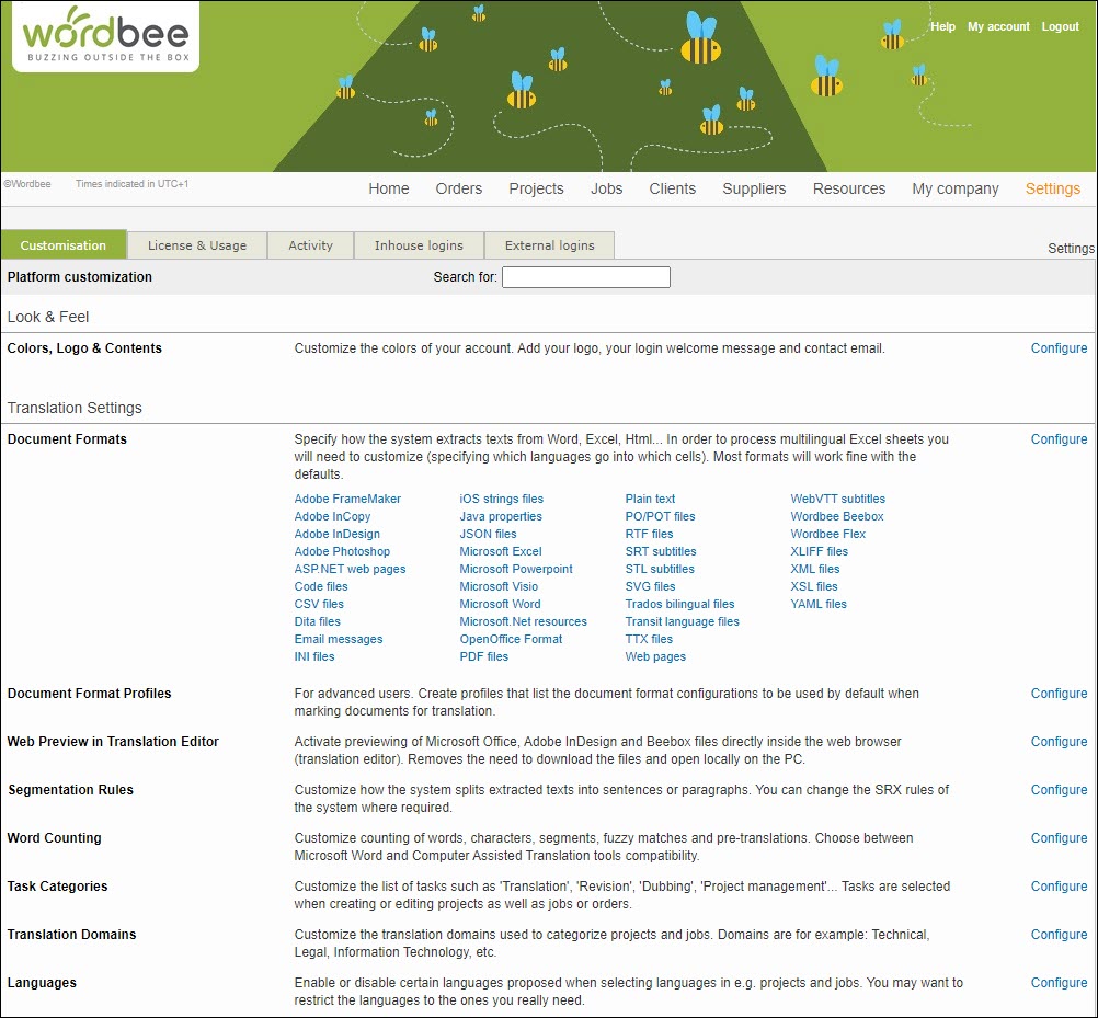 In the Translation Settings area of Wordbee Translator, you can adjust the behaviour of all the translation and linguistic work in the platform, from settings up text extraction rules for multilingual files (and assigning these profiles to each client) to defining the type of tasks to be performed within a workflow or even enabling the languages to be used in the platform.