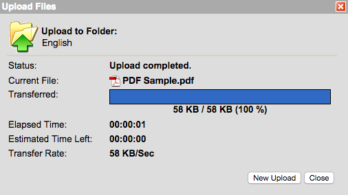 Click on Close to finish the upload and close the pop-up window. You may also click on New Upload to upload another document for the selected source or target language.