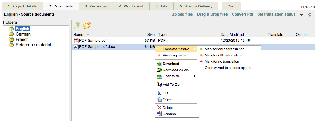 You now need to set the translation status of your document(s). Select the document(s) or simply right click on it in the Documents Tab. Then click on Translate Yes/No and choose an option from the submenu by clicking on it.