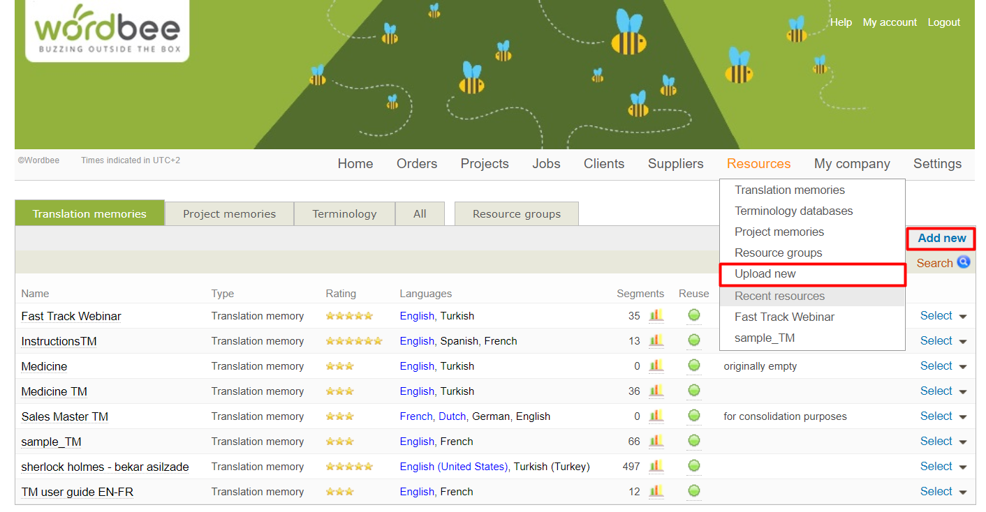 Wordbee Translator enables you to upload any existing linguistic resources (translation memory or termbase) into the system to use in your translation and localization projects. Follow the steps below to upload linguistic resources to Wordbee Translator.