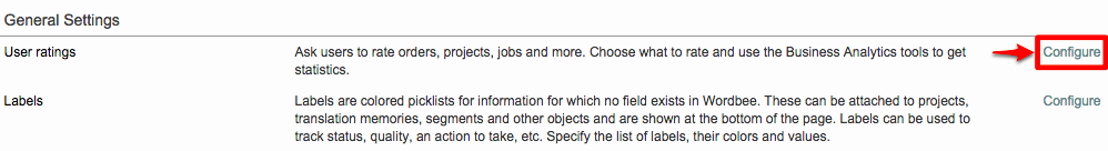 To access these settings, first click on Settings in the top toolbar and then scroll down to the General Settings section. Click on Configure to the right of the User Ratings option.