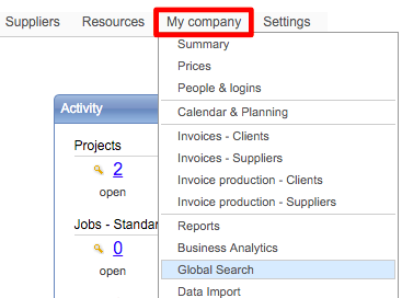 Or it can be accessed by hovering your mouse over My Company in the Menu Bar and then clicking on Global Search. On the landing page, type the search keywords into the box labeled "Type text to translate here" and click on Translate to perform the search.
