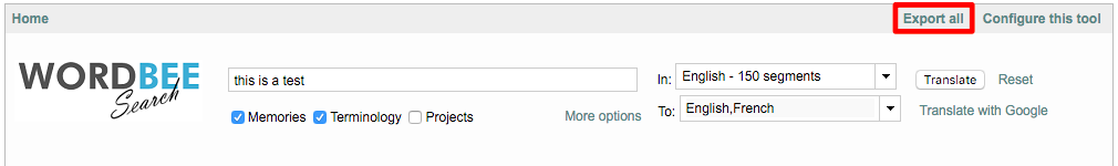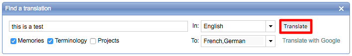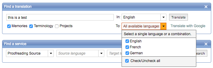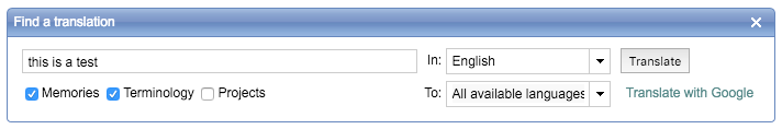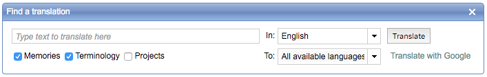 Global Search allows users to check for a term, phrase, or segment across resources (glossaries, translation memories, and project memories) for a source language and one or multiple target languages. It can be accessed by typing the search keyword(s) in the Find a Translation section of the Home Screen.