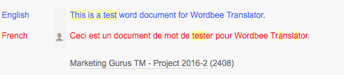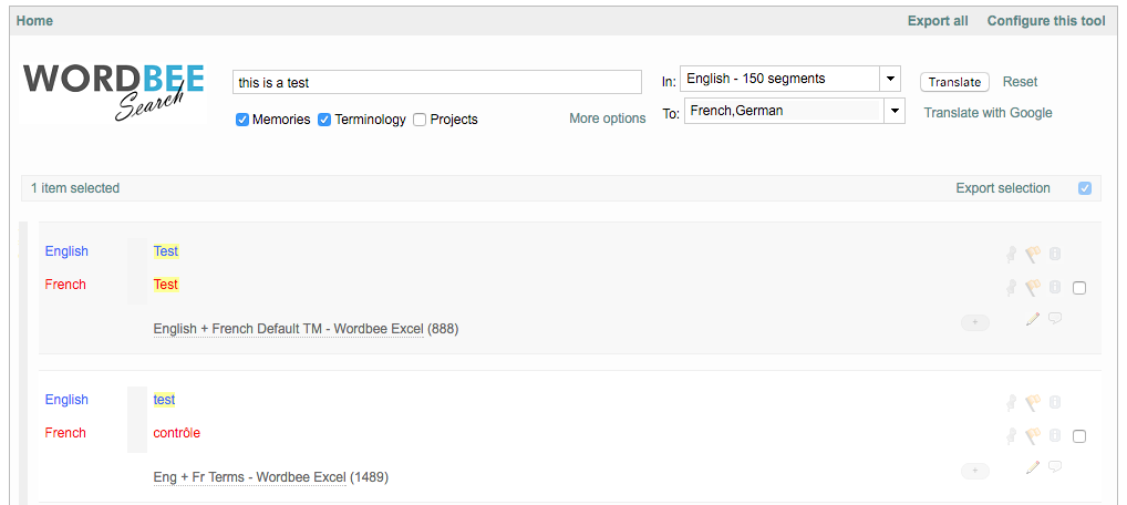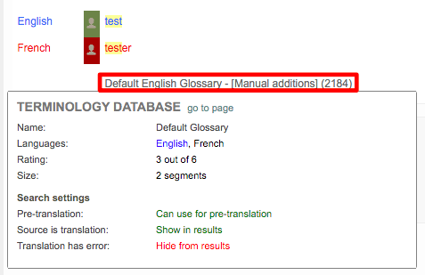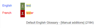 Changes will be reflected immediately in the Global Search results. In the shown example, the French Translation term "test" has been changed to "tester".