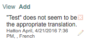 In some cases a translation could be incorrect and you can use Global Search to locate the translation among multiple resources and make suggestions for correction or correct it yourself (see next section). To make a suggestion, click on the Flag Icon for the appropriate term or segment.