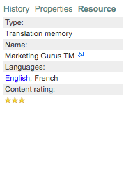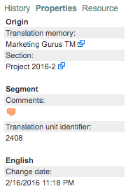 After clicking on the icon for a result, you will see it's properties including its origin, comments, and the change date. You may also click on History to see the history of the search result or Resource to view additional information about the resource where the term or segment resides.