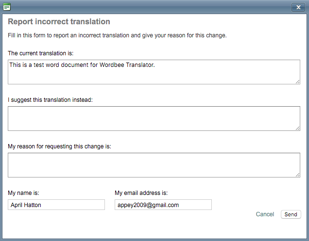 Then type in the suggested translation and your reason for the change request. Once finished, click on Send in the bottom right corner of this pop-up window. A confirmation window will also appear to show that the suggestion was successfully submitted.