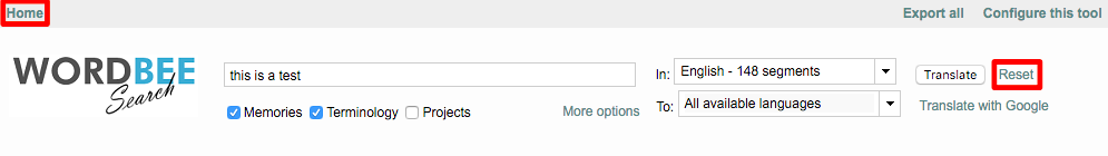 To return to your Home Page, click on Home in the upper left corner. You can also reset the search by clicking on Reset to the right of the Translate Button.