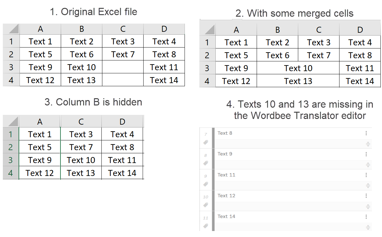Some cells on the Excel sheet might be merged across columns. One of the columns of a merged cell might be hidden, while another column of the merged cell might be visible. Content that was originally (before the merge) in the hidden column is still displayed in the visible column because the cells are merged. However, technically that content is still associated with the hidden column and not with the visible column. For this reason, the content is not extracted to the Wordbee Translator editor.