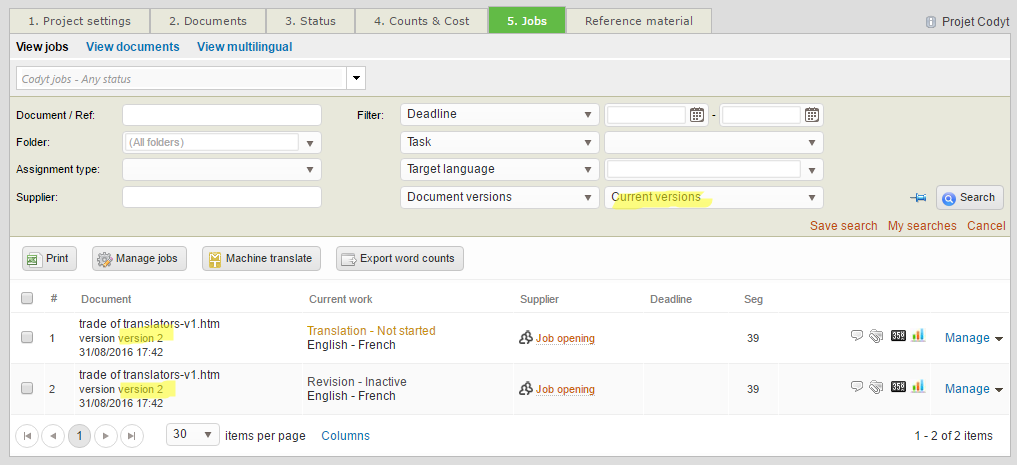 Now, if you reach the 'Jobs' tab of your project or in the main Jobs dashboard, you will see that you can filter on the jobs for the past and current document version: