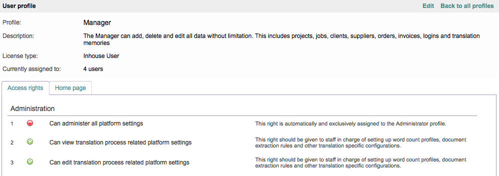 This will display the access rights for the chosen user profile. In the example below, Manager has been selected: