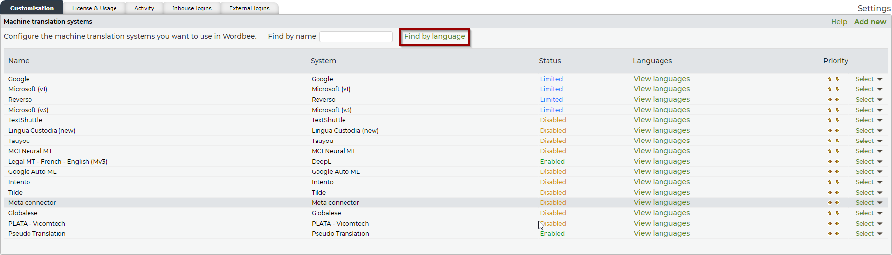 Once you have a number of MT systems enabled in Wordbee Translator, you may want to search for a specific system to check or change its settings. To quickly find your system, simply use the Find by name search bar at the top and filter your available systems.