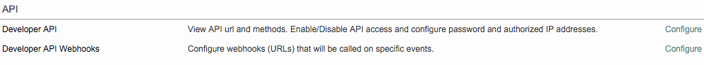 To access the settings for enabling the Webhook API, first click on Settings in the Menu Bar and scroll down to the API section. Click on Configure to the right of Developer API Webhooks.