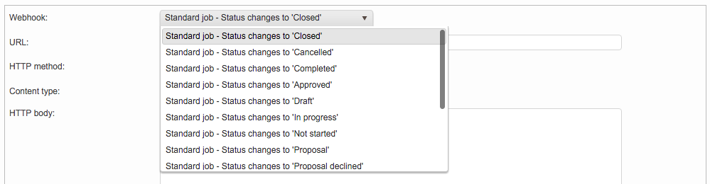 First, choose the Webhook you want to use by clicking on the Webhook drop-down menu. This is the status change that will trigger the API call and as mentioned above many options are provided for both Standard and CoDyt projects.