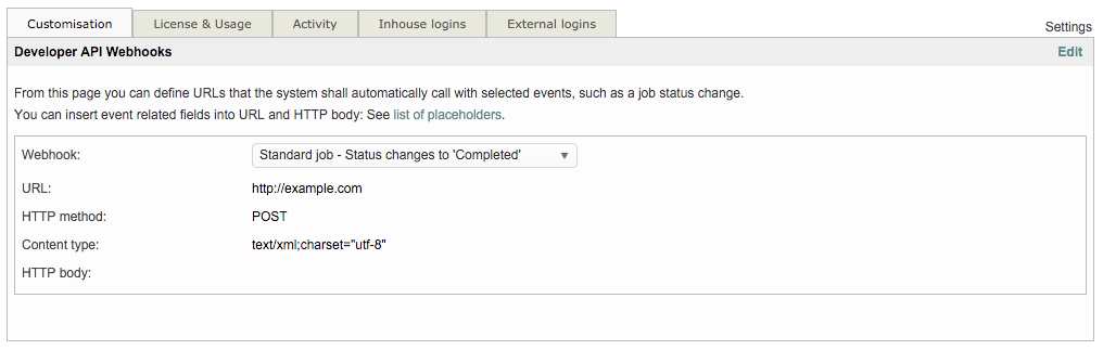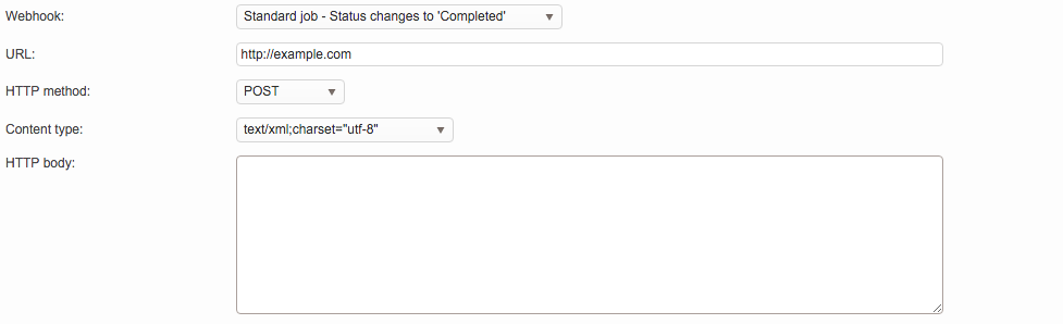 Webhooks are used to connect Wordbee Translator to an outside CRM or other type of application. These calls retrieve information from Wordbee and send the information to an outside system at a defined time interval such as 30 minutes, 1 hour, etc. They may be used to create events on one website or application that invoke a specific behavior on another. In Wordbee Translator, webhooks may be used to push real-time information to a website or another application based on a configured status change for a Standard or CoDyt project. In order to configure a webhook, you must do the following: