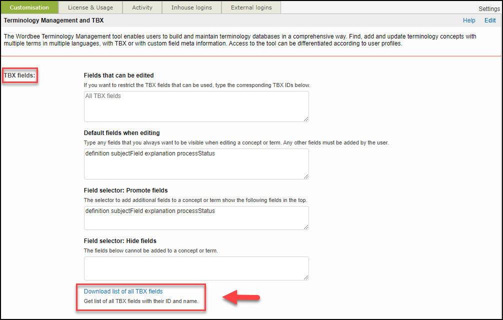 Step 1. In Terminology Management and TBX customization, click on Download list of all TBX fields that you see at the bottom of the TBX fields area.
