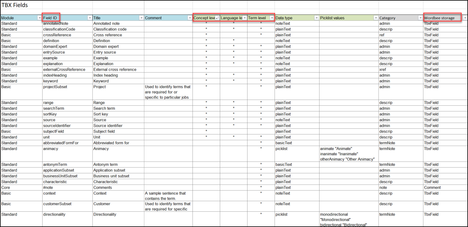Step 2. An XLSX file will open listing all the TBX fields supported by Wordbee. You can see the levels at which each field should appear in the terminolgical entry: Concept level, Language level or Term level. At each level, you can specify the type of data that the TBX field contains, for example the Defintion field contains plain text, whereas the Term Type field contains a picklist with several values from which you can choose (term, phrase, acronym etc.).