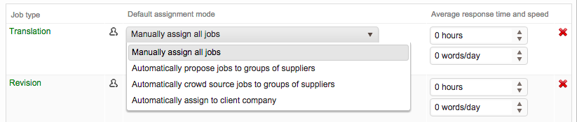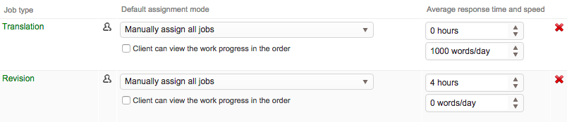 Additionally, the average response time and speed section can consist of any combination of hourly and words/day configurations as each task has its own settings. For example, the translation deadline could be configured to calculate off of words/day while the revision or proofreading tasks might be hourly.