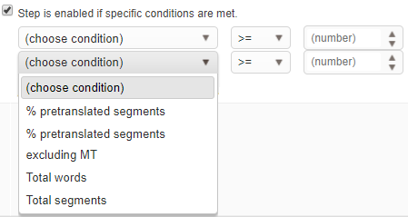 By default, there are no conditional steps. You can decide if jobs should be created based on volumes (segments to be translated, level of pre-translation, quality of pre-translation, etc.)