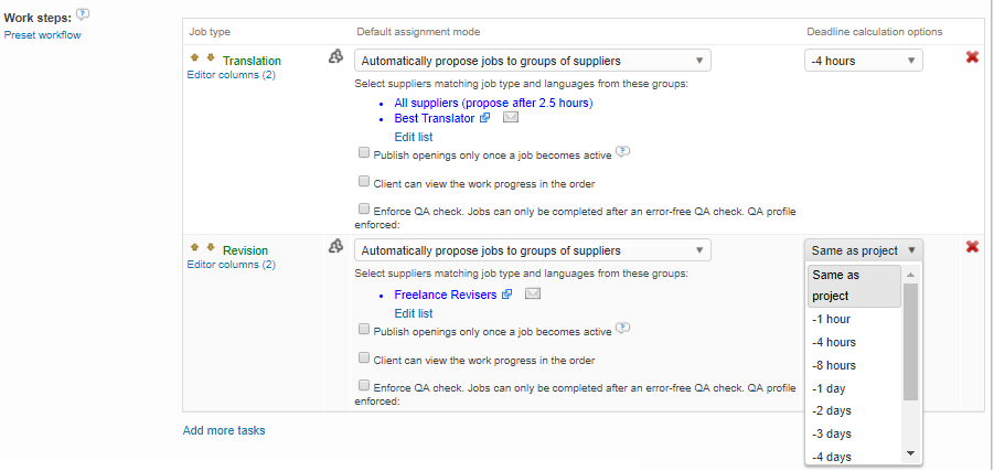 You can also calculate your job deadlines based on the actual project deadline. For this, you can select one of the values proposed in the dropdown list for each task in your workflow template.