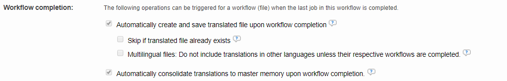 This section allows you to configure the level of automation that you want for your projects. Note that the following operations can be triggered for a workflow (file) when the last job in this workflow is completed.