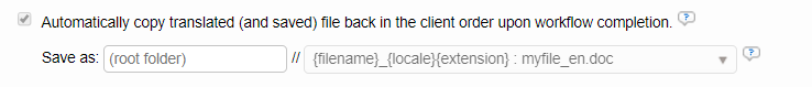 - The automatic delivery of client files via the client order upon workflow completion (this option is available only if you have Wordbee Client Portal): when the last job in a workflow is completed, the system can create the deliverable and copy them directly in the client order. Note that you can automatically append/prepend the file name with the target language locale.